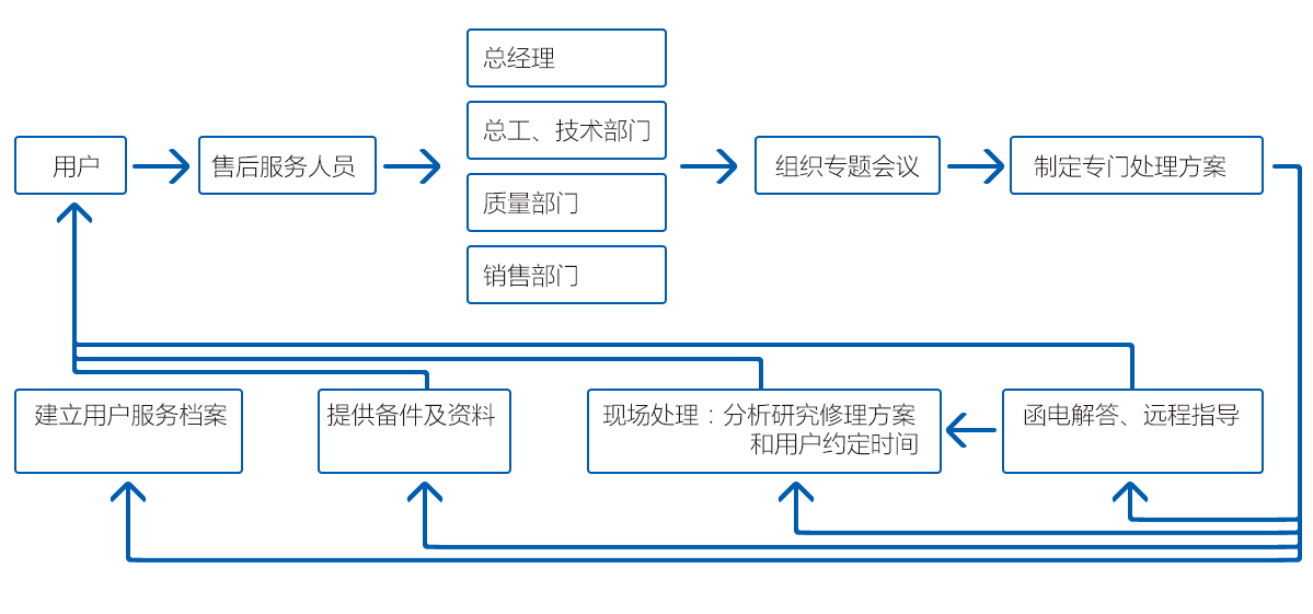 ② 對(duì)保修期外的產(chǎn)品,通過(guò)銷售,售后主管報(bào)價(jià)(包括零配件,人員出差等)費(fèi)用,迅速、果斷為用戶排除設(shè)備故障,讓用戶滿意;